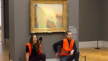 Εννέα μέρες αφότου το Just Stop Oil άδειασε σούπα ντομάτας πάνω στον πίνακα του Βαν Γκογκ στην Εθνική Πινακοθήκη του Λονδίνου, δύο ακτιβιστές από το Letzte Generation (Τελευταία Γενιά) μπήκαν στο Μουσείο Barberini και περιέλουσαν το Les Meules (Haystacks) του Μονέ με πουρέ πριν κολλήσουν τα χέρια τους στον τοίχο.