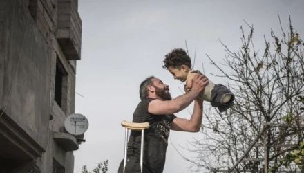 Πρόκειται για έναν πατέρα που έχει χάσει το ένα του πόδι κρατά ψηλά στα χέρια τον γιο του που γεννήθηκε χωρίς κάτω και άνω άκρα λόγω συγγενούς διαταραχής που προκλήθηκε από τα φάρμακα που έπρεπε να πάρει η μητέρα του όταν αρρώστησε μετά την απελευθέρωση τοξικών αερίων κατά τη διάρκεια του πολέμου στη Συρία.