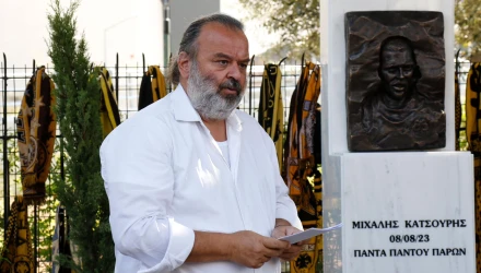 Αποκαλύφθηκε το μνημείο στο σημείο που δολοφονήθηκε ο Μιχάλης Κατσούρης στο μνημόσυνο του αδικοχαμένου οπαδού της ΑΕΚ στη Νέα Φιλαδέλφεια. Ο Μάριος Ηλιόπουλος τον χαρακτήρισε σύμβολο για την ΑΕΚ τονίζοντας πως μένει «αθάνατος» για όλους στην Ένωση.