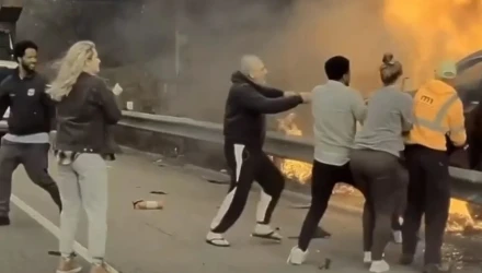 Στο βίντεο διακρίνονται πολλοί άνθρωποι συγκεντρωμένοι γύρω από το φλεγόμενο αυτοκίνητο να προσπαθούν να ανοίξουν τις πόρτες κι έναν εργαζόμενο στον αυτοκινητόδρομο να σπάει το παράθυρο του οδηγού για να βγάλουν έξω τον εγκλωβισμένο. Μετά από αρκετές προσπάθειες οι οδηγοί κατάφεραν να τον σύρουν από το παράθυρο του αυτοκινήτου, που είχε παραδοθεί στις φλόγες.
