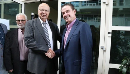 Ο πρόεδρος της ΕΟΚ κατά τη χειραψία του με τον νέο προπονητή της Εθνικής ομάδας μπάσκετ, Ρίκ Πιτίνο, έστειλε μήνυμα προς τον «αντίπαλο» του και προκάλεσε τα γέλια των παρευρισκομένων.