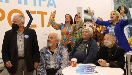 Ξέσπασαν σε χειροκροτήματα στα γραφεία της Νέας Δημοκρατίας στην Πειραιώς, τη στιγμή που ανακοινώθηκαν τα exit poll για τις βουλευτικές εκλογές της 21ης Μαΐου 2023.