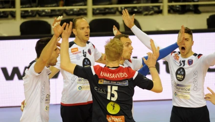 Στο πρώτο σετ, το παιχνίδι ήταν ισορροπημένο στο ξεκίνημα, όμως οι φιλοξενούμενοι πίεσαν και κατάφεραν να πάρουν μια διαφορά 5 πόντων. Ο Δικέφαλος αντέδρασε και μείωσε (14-15), όμως, οι Συριανοί έφτασαν και πάλι στο +5 (16-21), για να έρθει η άουτ επίθεση από τον Ντεν Ντρις και να διαμορφωθεί το 19-25.