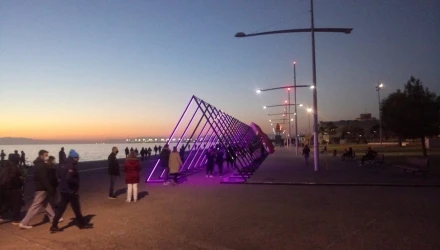 Τις τελευταίες ημέρες έχει στηθεί στη Νέα Παραλία ένας διαφορετικός χρωματιστός διάδρομος με μεταλλική τριγωνική κατασκευή.