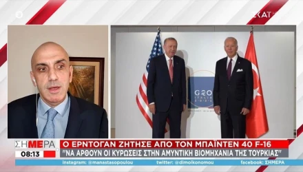 Όπως αναφέρει η ανακοίνωση που εκδόθηκε από το γραφείο του Ερντογάν, ο Τούρκος πρόεδρος τόνισε στον Αμερικανό ομόλογό του πως έχει έρθει η ώρα να αρθούν όλες οι «άδικες» κυρώσεις σε βάρος της τουρκικής αμυντικής βιομηχανίας ενώ παράλληλα εξέφρασε την επιθυμία του να αγοράσει 40 νέα μαχητικά αεροσκάφη F-16.