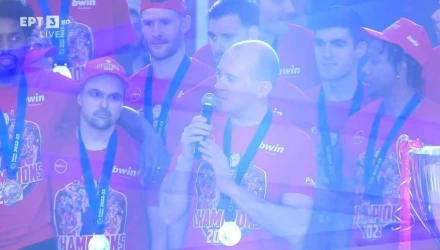 Ο Γιώργος Αγγελόπουλος κατά τη διάρκεια της φιέστας στο ΣΕΦ για την κατάκτηση του Πρωταθλήματος ζήτησε από τον κόσμο του Ολυμπιακού να σταματήσει υβριστικό σύνθημα κατά του Παναθηναϊκού.