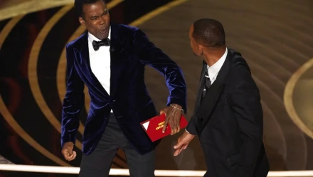 Ο Σμιθ ανέβηκε ξαφνικά στη σκηνή και χαστούκισε τον Ροκ υπό το άναυδο βλέμμα διασημοτήτων και θεατών.