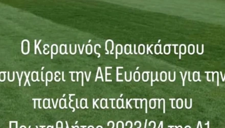 Ο Κεραυνός Ωραιοκάστρου συγχαίρει την ΑΕ Ευόσμου για την πανάξια κατάκτηση του Πρωταθλήματος της Α1 της ΕΠΣ Μακεδονίας.