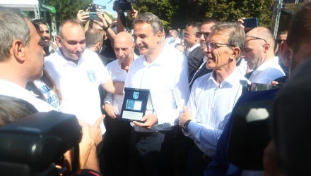 Ο πρωθυπουργός Κυριάκο Μητσοτάκης βρέθηκε στο περίπτερο της ΠΑΕ Ηρακλής και μίλησε με τους ανθρώπους της ομάδας που ήταν εκεί, ενώ στον Έλληνα πρωθυπουργό δόθηκε μια τιμητική πλακέτα.