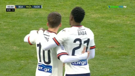 Στο 45+1' οι παίκτες του ΠΑΟΚ έφυγαν στην αντεπίθεση, η μπάλα έφτασε στον Μουργκ, μετά από παράλληλο γύρισμα και αδράνεια του Τσοκάνη να απομακρύνει τη μπάλα, με τον Αυστριακό να πιάνει ένα δυνατό σουτ, στέλνοντας τη μπάλα στα δίχτυα του Βόλου για το 0-2.