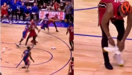 Ειδικότερα, ο ίδιος στην προσπάθεια του να ξεφύγει από τα σκριν , είδε το παπούτσι του να μένει... πίσω , με τον ίδιο να συνεχίζει τη φάση και στο φινάλε αυτής μάλιστα να πετυχαίνει καλάθι ενώ το παπούτσι του βρισκόταν στο παρκέ.
