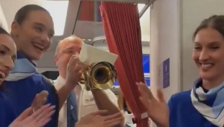 Ο πιλότος παίζει τον ύμνο του Ολυμπιακού με... τρομπέτα! Άφησε για λίγο το πιλοτήριο και έγινε... οργανωτής με τρομπέτα ο πιλότος στην πτήση της επιστροφής του Ολυμπιακού από τη Βαρκελώνη.