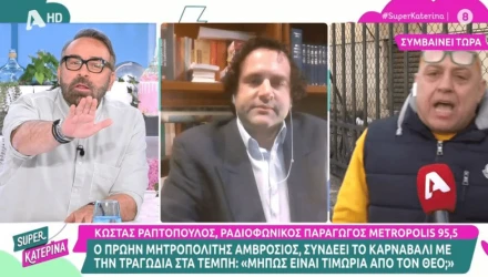 Στην εκπομπή του Alpha με την Κατερίνα Καινούργιου, «Super Κατερίνα», φιλοξενήθηκε ο ραδιοφωνικός παραγωγός του Metropolis 95.5 , Κωστής Ραπτόπουλος, ο οποίος αναφέρθηκε στα όσα δήλωσε ο πρώην Μητροπολίτης Αμβρόσιος, συνδέοντας το καρναβάλι με την τραγωδία στα Τέμπη, με τον Κωστή Ραπτόπουλο να υπογραμμίζει πως τόσο η πολιτική όσο και η εκκλησία πάσχει από έλλειψη επικοινωνιολόγων.