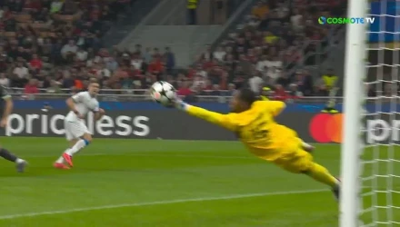 Στο 2ο λεπτό ο διεθνής επιθετικός πάτησε στην περιοχή των γηπεδούχων και με δυνατό σουτ προσπάθησε να στείλει τη μπάλα στα δίχτυα της Μίλαν, αλλά ο Γάλλος γκολκίπερ έδιωξε με τα πόδια.