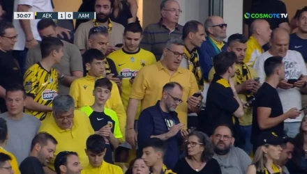 Δεν είδαν με καλό μάτι οι οπαδοί της ΑΕΚ το γκολ του ΠΑΟΚ. Η ομάδα του Ραζβάν Λουτσέσκου προηγείται 1-0 του Άρη στο ''Κλεάνθης Βικελίδης'' κι αν μείνει έτσι το σκορ μέχρι το τέλος του αγώνα τότε οι ''ασπρόμαυροι'' θα πανηγυρίσουν το τέταρτο Πρωτάθλημα στην ιστορία τους.