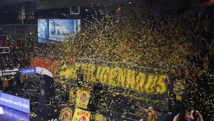 Τρομερή ατμόσφαιρα από τους φιλάθλους του Άρη, που ταξίδεψαν στη Γερμανία, για να βρεθούν στο πλευρό της αγαπημένης τους ομάδας, γεμίζοντας το παρκέ με κίτρινα χαρτάκια.