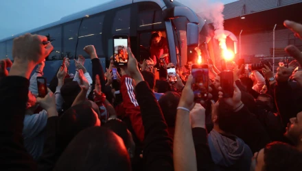 Αποθεωτική υποδοχή... «Θρύλε σ' αγαπώ, φέρτε μας το ευρωπαϊκό», «μέχρι τέλους, οε οε οε» ήταν μερικά από τα συνθήματα, που ακούστηκαν κατά την άφιξη της ομάδας μπάσκετ του Ολυμπιακού, μετά από την πρόκριση της ομάδας στο Final Four του Βερολίνου με τη νίκη στη Βαρκελώνη.