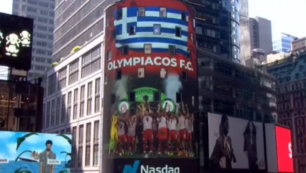 Συγκεκριμένα, στην εμβληματική πλατεία της Νέας Υόρκης «Times Square», όπου συγκεντρώνονται εκατομμύρια άνθρωποι καθημερινά, το Nasdaq billboard παίζει στις οθόνες του την κατάκτηση του Conference League από τον Ολυμπιακό.