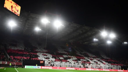 Λίγα λεπτά νωρίτερα, η «ερυθρόλευκη» ΠΑΕ πρόβαλε από τους πίνακες του γηπέδου βίντεο-αφιέρωμα για τα θύματα της Θύρας 7, δημιουργώντας έντονα φορτισμένο κλίμα στις εξέδρες.