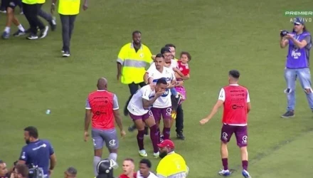 Συνέβη και αυτό. Ένας οπαδός της Ιντερνασιονάλ εισέβαλε στον αγωνιστικό χώρο κρατώντας ένα κοριτσάκι στην αγκαλιά του και κλώτσησε παίκτη της αντιπάλου, Κασίας! Το περιστατικό συνέβη με την ολοκλήρωση του αγώνα.