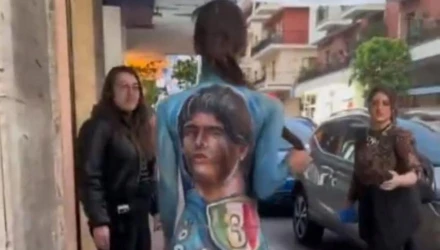 Με τον Ντιέγκο Μαραντόνα, τον Βίκτορ Όσιμεν, το σήμα του κλαμπ και τον αριθμό τρία σε μπλε φόντο να καλύπτουν το καλλίγραμμο κορμί της, η εντυπωσιακή φίλαθλος έβαλε ψηλοτάκουνα και βγήκε να περπατήσει, μαγνητίζοντας, προφανώς, τα βλέμματα..