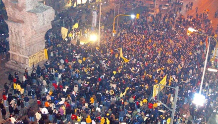 Ενα από τα πολλά συλλαλητήρια-συγκεντρώσεις εκείνης της χρονιάς, με σκοπό και στόχο την αλλαγή σελίδας στα διοικητικά του ποδοσφαιρικού Αρη. Με κεντρικό σύνθημα «Πριν η κάλπη σας μαυρίσει, Βενιζέλο δώσε λύση» οι χιλιάδες οπαδοί του Αρη απαίτησαν από την κυβέρνηση να επέμβει και να δώσει λύσεις στους «κίτρινους». Τόσο σε ότι αφορούσε τα χρέη της ΠΑΕ, όσο και στην αλλαγή της μετοχικής σύνθεσης. Μετά από αρκετούς μήνες, η επιθυμία εκείνη έγινε πράξη, αφού οι Τσαρούχας-Καραμπέρης και όλοι οι υπόλοιποι παράγοντες, παρέδωσαν τις μετοχές τους και η ομάδα πέτυχε την υπαγωγή της στο άρθρο 44 απαλλασσόμενη από μέρος των υπέρογκων χρεών της.