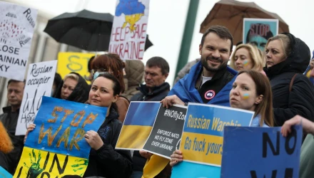 Άνθρωποι όλων των ηλικιών κρατώντας σημαίες με τα χρώματα της Ουκρανίας αλλά και πλακάτ στέλνουν μήνυμα ειρήνης, ενώ μάλιστα έψαλαν τους εθνικούς ύμνους των δύο χωρών.