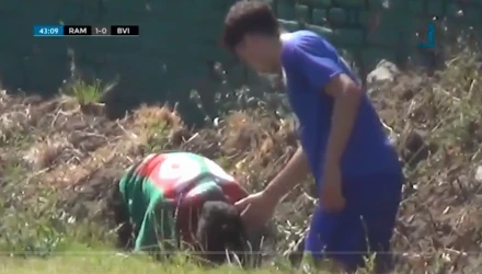 Οι φίλαθλοι έμειναν άναυδοι, ενώ ποδοσφαιριστής της αντίπαλης ομάδας πήγε πάνω από τον τον λάκκο που είχε βρεθεί για να τον βοηθήσει. Ευτυχώς, ο νεαρός δεν έπαθε τίποτα σοβαρό και συνέχισε να παίζει σαν να μην είχε συμβεί τίποτα.