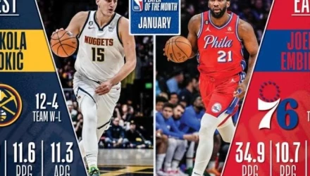 Ο Γιόκιτς στα 16 παιχνίδια που αγωνίστηκε τον προηγούμενο μήνα μέτρησε 24 πόντους, 11,6 ριμπάουντ και 11,3 ασίστ ενώ ο Εμπίιντ σε 14 ματς είχε 34,9 πόντους, 10,7 ριμπάουντ και 1,6 τάπες κατά μέσο όρο.