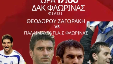 Φιλικός ποδοσφαιρικός αγώνας για φιλανθρωπικό σκοπό θα γίνει σήμερα στις 5μμ στο Δ.Α.Κ. Φλώρινας μεταξύ των ομάδων “ΦΙΛΟΙ ΘΕΟΔΩΡΟΥ ΖΑΓΟΡΑΚΗ” VS. “ΠΑΛΑΙΜΑΧΟΙ ΠΑΣ ΦΛΩΡΙΝΑ”. Τον αγώνα συνδιοργανώνουν η ΕΠΣ Φλώρινας με την υποστήριξη της Περιφέρειας Δυτικής Μακεδονίας, των Δήμων Φλώρινας, Αμυνταίου και Πρεσπών καθώς και της εταιρίας ΛΙΓΝΙΤΩΡΥΧΕΙΑ ΑΧΛΑΔΑΣ.