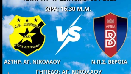 Κάλεσμα του Αστέρα Αγίου Νικολάου: Ο Αστέρας Αγίου Νικολάου υποδέχεται τη Βέροια και οι ιθύνοντες του συλλόγου με ανακοίνωση τους ανέφεραν: "Ιστορικό παιχνίδι για την ομάδα μας. Στη 2η Φάση του Κυπέλλου Ελλάδος, ο Α.Σ. Αστέρας Αγίου Νικολάου θα αντιμετωπίσει μία μεγάλη και ιστορική ομάδα, τη Βέροια. Καλούμε όλους τους φιλάθλους μας, αλλά και τους φίλους του ποδοσφαίρου από όλη τη Σιθωνία και τη Χαλκιδική, να βρεθούν στο πλευρό μας και να δώσουν με τη φωνή τους δύναμη στην ομάδα»