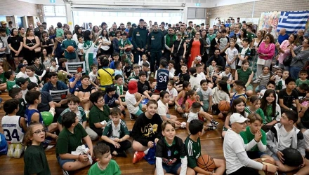 Η περιοδεία του Παναθηναϊκού στην Αυστραλία, δεν έχει μόνο αγωνιστικό αποτύπωμα. Αντιπροσωπεία της «πράσινης» ΚΑΕ, με την κα. Δέσποινα Γιαννακοπούλου, τον πρόεδρο Βασίλη Παρθενόπουλο, τον CEO Σταύρο Ντίνο και τους καλαθοσφαιριστές Παναγιώτη Καλαϊτζάκη και Βασίλη Τολιόπουλο, επισκέφθηκε το Σχολείο Ελληνικής Γλώσσας της Ελληνορθόδοξης Κοινότητας Νέας Νότιας Ουαλίας στο Σίδνεϊ, σκορπίζοντας χαμόγελα αλλά και δώρα στους μικρούς μαθητές.