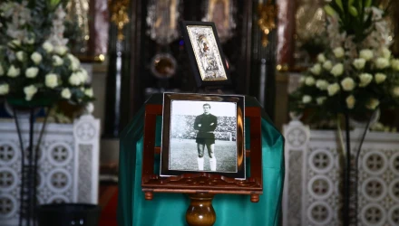 Το φέρετρο του Τάκη Οικονομόπουλου είναι τυλιγμένο με τη σημαία του Παναθηναϊκού, την ομάδα που υπηρέτησε για 13 χρόνια.