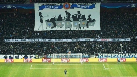 Κατά τη διάρκεια της χθεσινής αναμέτρησης, η οποία έληξε χωρίς τέρματα, οι οπαδοί της Κοπεγχάγης έκλεψαν την παράσταση υψώνοντας ένα τεράστιο πανό το οποίο απεικόνιζε ανθρώπους να κάθονται γύρω από ένα τραπέζι και να συζητούν ενώ στις καρέκλες τους υπήρχαν τα σήματα της Γιουβέντους, της Ρεάλ Μαδρίτης, της Τσέλσι, της Μπάγερν Μονάχου, της Μπαρτσελόνας και της Παρί Σεν Ζερμέν.