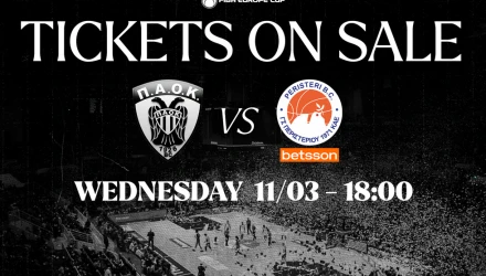 Η ΚΑΕ ΠΑΟΚ ανακοινώνει ό,τι ξεκίνησε η διάθεση των εισιτηρίων για τον αγώνα ΠΑΟΚ – Περιστέρι Betsson που θα διεξαχθεί στο PAOK Sports Arena την Τετάρτη (11/3) στις 18:00 για την προημιτελική φάση του FIBA Europe Cup.
