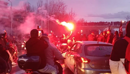 Οι φίλαθλοι των ασπρόμαυρων φώναξαν συνθήματα, εφοδιασμένοι με κασκόλ και σημαίες, και στη συνέχεια ετοιμάστηκαν για να συνοδέψουν με μοτοπορεία την αποστολή μέχρι το γήπεδο.
