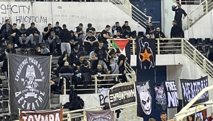 Οι φίλοι των «ασπρόμαυρων», οι οποίοι επέλεξαν να δουν τον αγώνα από κοντά, κρέμασαν τη σημαία της Παλαιστίνης θέλοντας να δείξουν την αντίθεση τους στον πόλεμο που λαμβάνει χώρα και τη στήριξη τους στον άμαχο πληθυσμό που χάνει τη ζωή του.