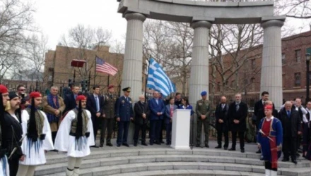 Στη τελετή παρέστησαν και μίλησαν ο πρόεδρος της Διακομματικής Επιτροπής της Βουλής Αλέξανδρος Τριανταφυλλίδης, ο γενικός Πρόξενος της Ελλάδας Δρ. Κωνσταντίνος Κούτρας, ο πρόξενος Μάνος Κουμπαράκης, ο τελετάρχης Ιβάν Σαββίδης, ο πρόεδρος της Ομοσπονδίας Ελληνικών Σωματείων Μείζονος Νέας Υόρκης Πέτρος Γλάτουλας, η γενική γραμματέας Νομική Καστανά, ο δήμαρχος Χίου Μανώλης Βουρνούς, ο πτέραρχος Γρηγόρης Πεζεράκος, ο στρατηγός ε.α. Φράγκος Φραγκούλης, ο ναύαρχος ε.α. Σταύρος Μιχαηλίδης και ο στρατηγός ε.α. Χρήστος Μανωλάς, τα μέλη της Διοικούσας Επιτροπής της Πλατείας Αθηνών και εκπρόσωποι ομογενειακών οργανώσεων.