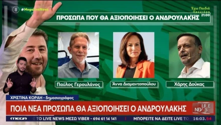 Ενώ τα νέα πρόσωπα που κι αυτά οδεύουν προς αξιοποίηση στο επιτελείο του κ. Ανδρουλάκη είναι οι: Κώστας Τσουκαλάς, Λευτέρης Καρχιμάκης, Όλγα Μαρκογιαννάκη και Βαγγέλης Τσόγκας.
