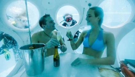 Στο δείπνο, βέβαια, το «dress code» προτείνει αυστηρά μαγιό, ενώ οι δύτες εμφανίζονται ανά διαστήματα με αδιάβροχα βαλιτσάκια γεμάτα γκουρμέ λιχουδιές. Όσο για το αντίτιμο, η ιδιαίτερη εμπειρία κοστίζει 99 ευρώ ανά άτομο και μέχρι στιγμής ήδη 16 ζευγάρια τη δοκίμασαν, δηλώνοντας ότι θα τη θυμούνται για το υπόλοιπο της ζωής τους.