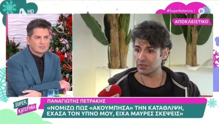 Ο Παναγιώτης Πετράκης φιλοξενήθηκε στην εκπομπή "Super Κατερίνα" και μίλησε για την αλωπεκίαση που έπαθε εξαιτίας έντονου άγχους, ενώ αναφέρθηκε και στη συνεργασία του με τον Γιώργο Κιμούλη.