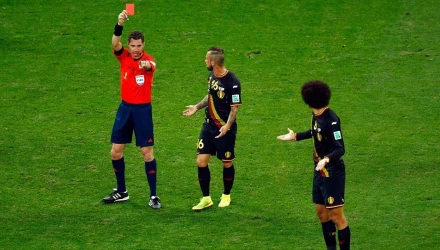 Απόλυτα δικαιολογημένη η κόκκινη κάρτα που δέχτηκε ο Ντεφούρ του Βελγίου καθώς σε έναν αδιάφορο αγώνα για την ομάδα του λίγο έλειψε να σπάσει το πόδι του Κιμ ένα από τα πιο βάναυσα μαρκαρίσματα του Παγκοσμίου Κυπέλλου.
