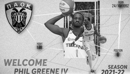 Η ΚΑΕ ΠΑΟΚ mateco ανακοινώνει την συμφωνία με τον Αμερικανό καλαθοσφαιριστή Phil Greene IV, ο οποίος θα ενισχύσει την ομάδα μας ως το τέλος της αγωνιστικής περιόδου 2021-22.