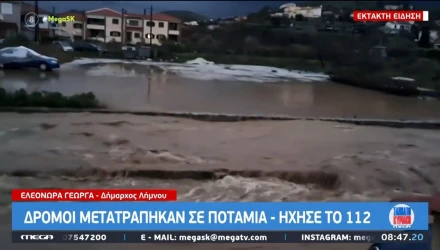 Σύμφωνα με πληροφορίες, χείμαρρος στην περιοχή έχει υπερχειλίσει, μετατρέποντας τους δρόμους σε ποτάμια στη Μύρινα και την πλατεία Ελ. Βενιζέλου στα ΚΤΕΛ, με τη στάθμη του νερού να έχει αυξηθεί, παρασύροντας φερτά υλικά και δημιουργώντας επικίνδυνες συνθήκες για οδηγούς και πεζούς. Μάλιστα, τα τοπικά Μέσα αναφέρουν ότι συνεργεία του δήμου βρέθηκαν από νωρίς σε διάφορες περιοχές για την απομάκρυνση υδάτων και τον καθαρισμό των δρόμων, με τις ζημιές να είναι εκτεταμένες. «Oι τόνοι του νερού που έχουν πέσει είναι διπλάσιοι από την ισχυρή κακοκαιρία του 2024», τόνισε μεταξύ άλλων η δήμαρχος της Λήμνου μιλώντας στο Mega.