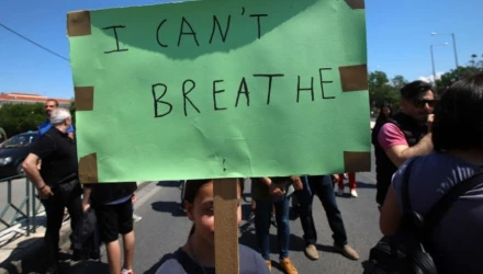 Σήκωσαν επίσης πλακάτ με το σύνθημα «I Can't breath», που παραπέμπει στα τελευταία λόγια του 46χρονου Αφροαμερικανού, Τζορτζ Φλόιντ, από αστυνομικό στη Μινεάπολη, που ξεσήκωσε κύμα οργής και διαμαρτυρίας εντός και εκτός των συνόρων των ΗΠΑ.