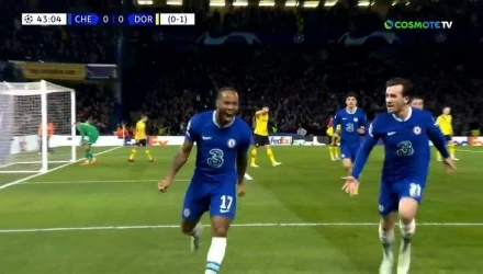 Στο 43' ο Στέρλινγκ με διπλή προσπάθεια μέσα από την περιοχή, άνοιξε το σκορ για τους μπλε του Λονδίνου.