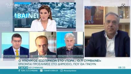 Ο υπουργός Εσωτερικών Τάκης Θεοδωρικάκος μίλησε σε τηλεοπτική εκπομπή μεταξύ άλλων, για την εξέλιξη της πανδημίας στην χώρα, την έκτακτη επιχορήγηση στους δήμους λόγω απώλειας εσόδων, για τις προσλήψεις στο δημόσιο και το σύστημα με το οποίο θα γίνουν.
