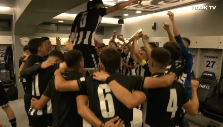 Η Κ17 του ΠΑΟΚ νίκησε τον Παναθηναϊκό με 1-0 στην Τούμπα με το γκολ του Κυριαζίδη στο 51’ και αυτό ήταν το κερασάκι στο πάρτι που στήθηκε στον αγωνιστικό χώρο και τα αποδυτήρια της Τούμπας. Η ομάδα του Δημήτρη Ορφανού και του Αντώνη Κρινίτσα το γιόρτασε με συνήθειες ανδρικής ομάδας και η κάμερα του ΠΑΟΚ TV ήταν εκεί για να καταγράψει όλες τις ξεχωριστές στιγμές, μεταξύ αυτών και την απονομή της κούπας και των μεταλλίων από τους Αντρέ Βιεϊρίνια και Δημήτρη Πέλκα.