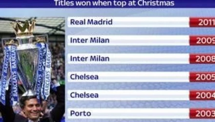 Ο Μουρίνιο όταν ήταν προπονητής της Ρεάλ, της Ίντερ, της Τσέλσι την πρώτη φορά και της Πόρτο, όποτε ήταν η ομάδα του στην κορυφή της βαθμολογίας τα Χριστούγεννα είχε κατακτήσει το πρωτάθλημα το καλοκαίρι.