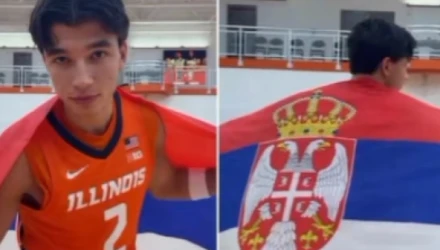 Μαζί του είναι ο Ντέιβιντ Μίρκοβιτς, Μαυροβούνιος συμπαίκτης του στο Ιλινόις, που κρατά τη σημαία της χώρας του.
